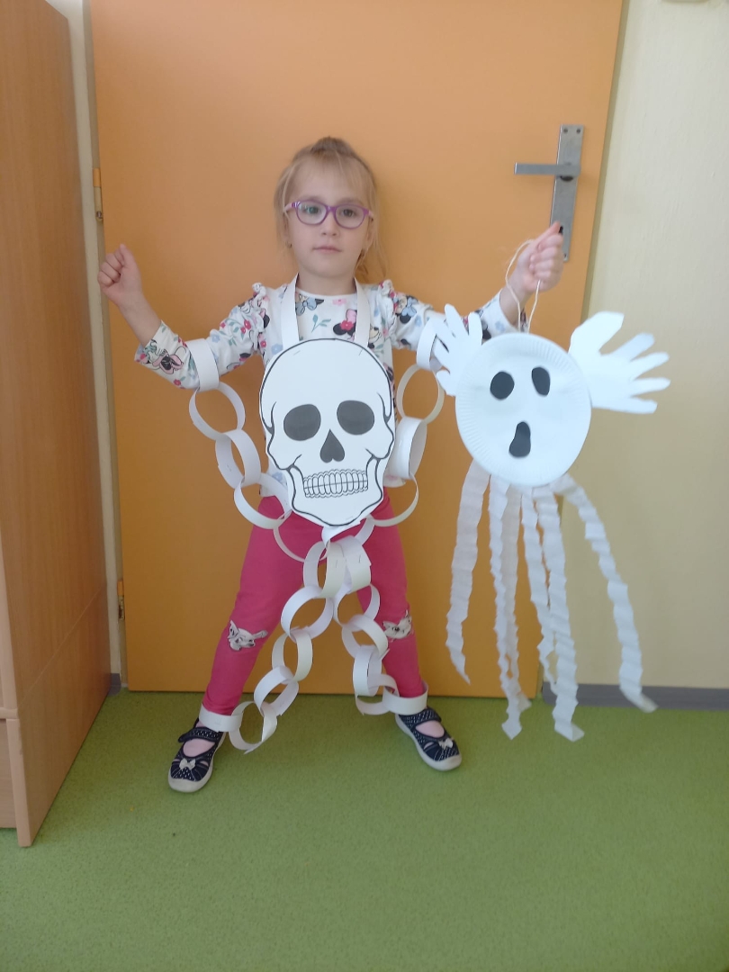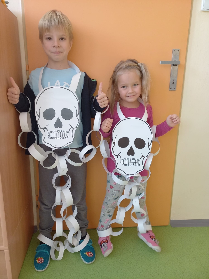 Nechyběla ani výtvarná tvorba – malování čarodějnic, duchů a dýní, skládání řetězů z papíru a zdobení prostor tematickými obrázky. Děti se učily spolupracovat, rozvíjely svou fantazii i jemnou motoriku.