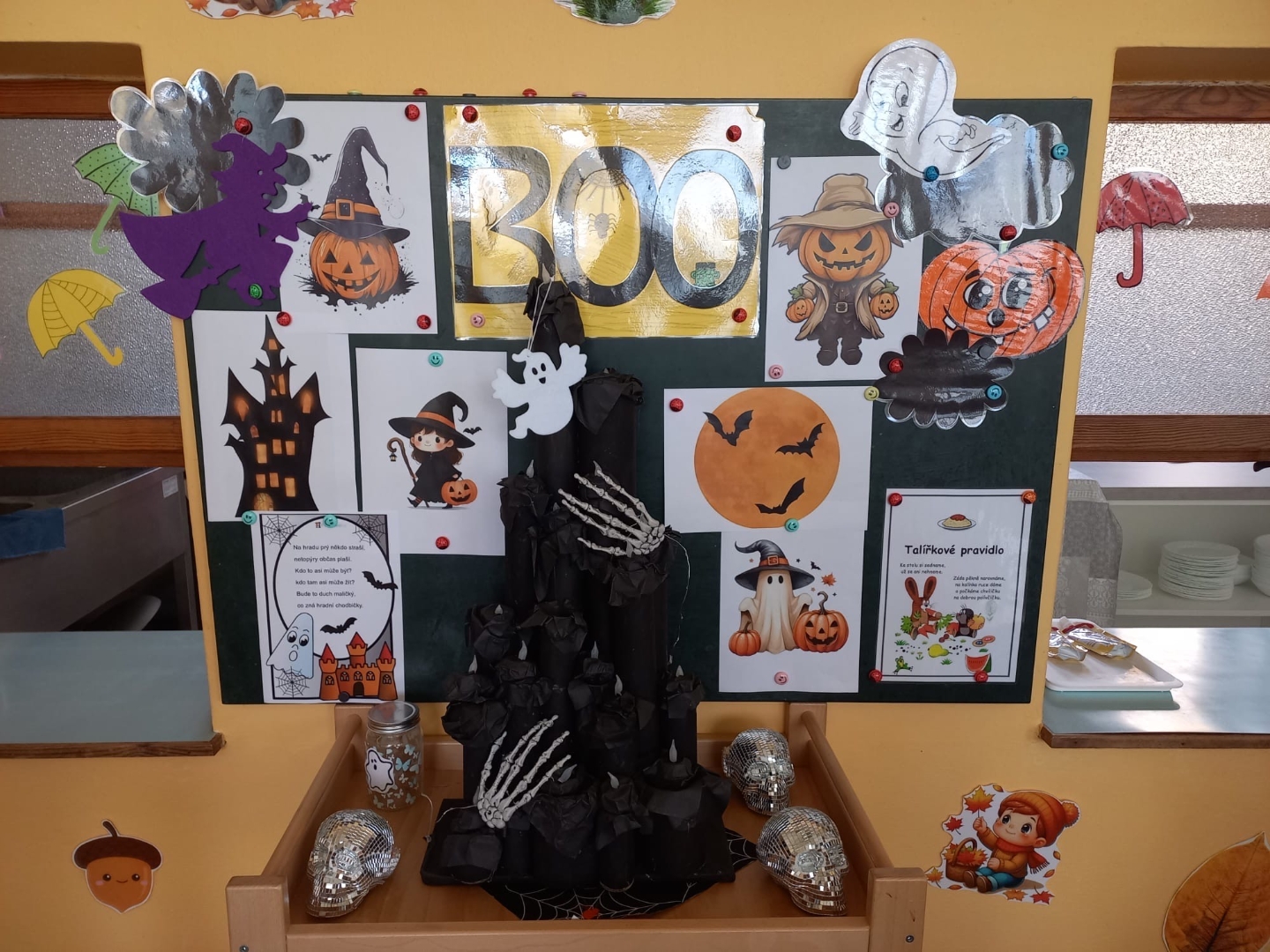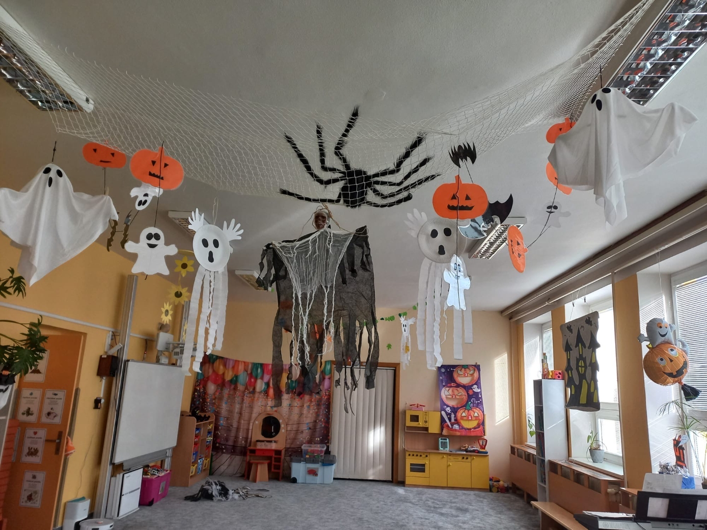 Společně jsme vyráběli strašidla z papírových talířů, řetězové kostlivce i veselé dýně. Naše třída se proměnila ve strašidelný zámek – ze stropu visí duchové, pavouci a netopýři, na stěnách se usmívají dýně a kouty zdobí malá halloweenská zákoutí. Děti se podílely na každém kroku, a tak si mohly užít radost z vlastní práce i z proměny třídy, která teď hýří oranžovou, černou a bílou barvou.