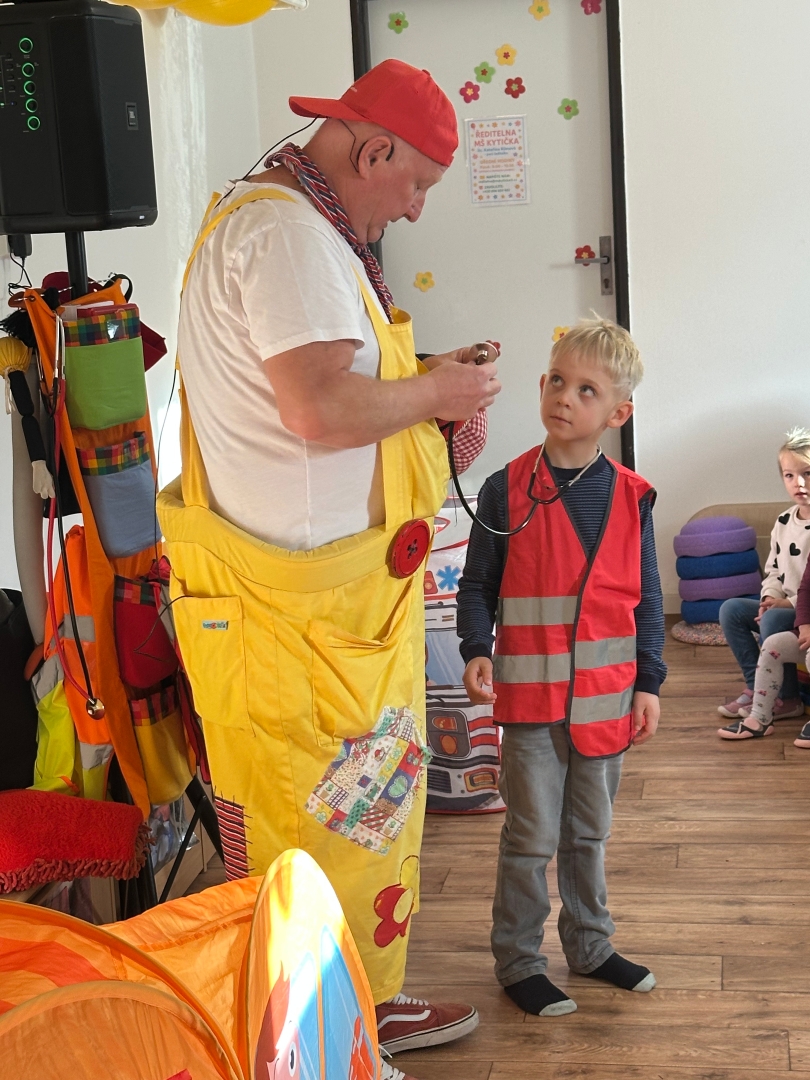 V pátek 14.11. 2025 jsme se opět vypravili na divadelní představení do naší spřátelené MŠ Kytička, tentokrát jsme zhlédli vystoupení Honzy Krejčíka s novým interaktivním programem „Malý záchranář“. Děti se prostřednictvím písniček, her a veselých scének seznámily s tím, jak pečovat a chránit své zdraví a předcházet případným úrazům. Jak se chovat v nebezpečných situacích a koho volat, když se něco stane a jak pomoci kamarádovi. Dále si názorně předvedly, z jakých potravin se skládá zdravý talíř.