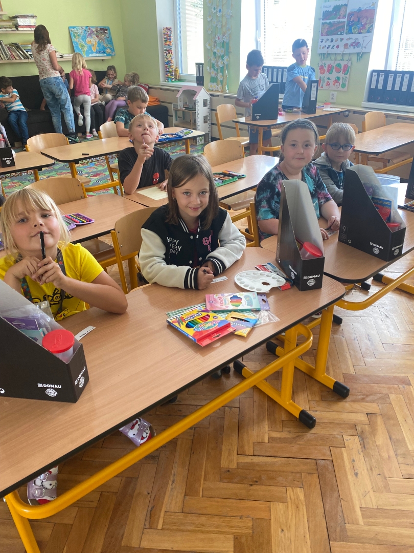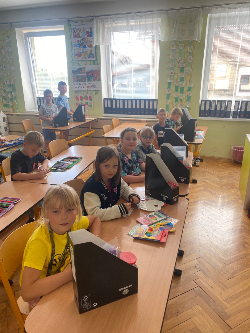 Děti s radostí také uvítaly novinku ve školní družině, balíčky výtvarných pomůcek a prostorná pouzdra na ně. Vše obdržely jako dárek od školy. Pomůcky budeme stále používat při výtvarných činnostech, kterým se ve školní družině hodně věnujeme.