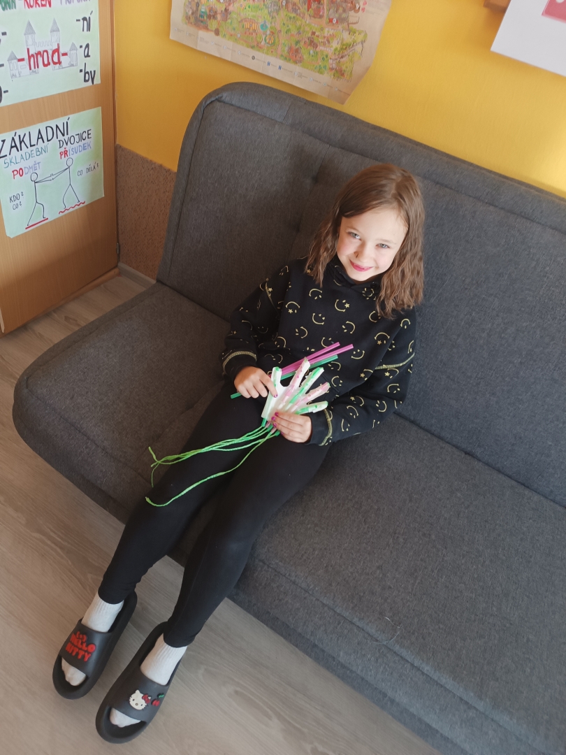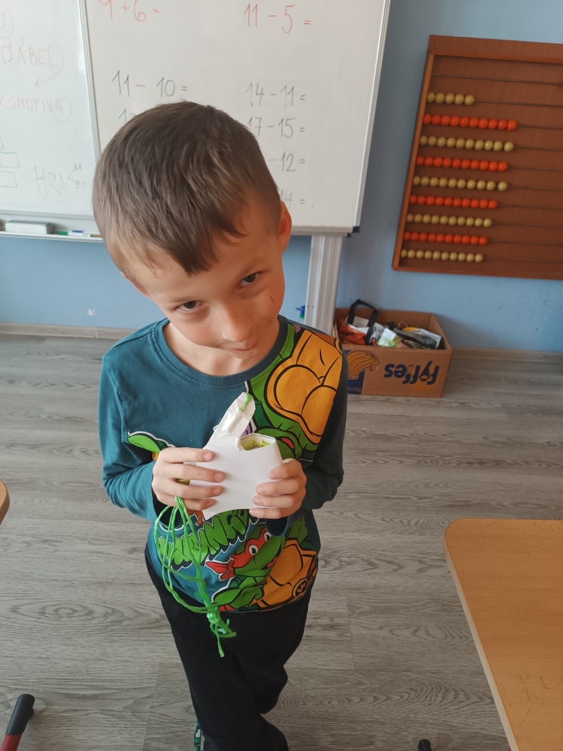 Druhá hodina se věnovala fungování lidského ruky, kdy jsme si pomocí papíru, brček a provázku vyrobili model ruky, ukázali si jak by se špatně žilo bez palce a zkusili si pokus proč je důležité si mýt ruce mýdlem.