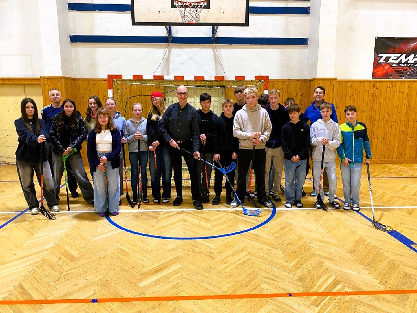 Na závěr setkání vznikla symbolická fotografie – všichni s florbalovými hokejkami v brance, kam patří nejen góly, ale i naše společné úspěchy.