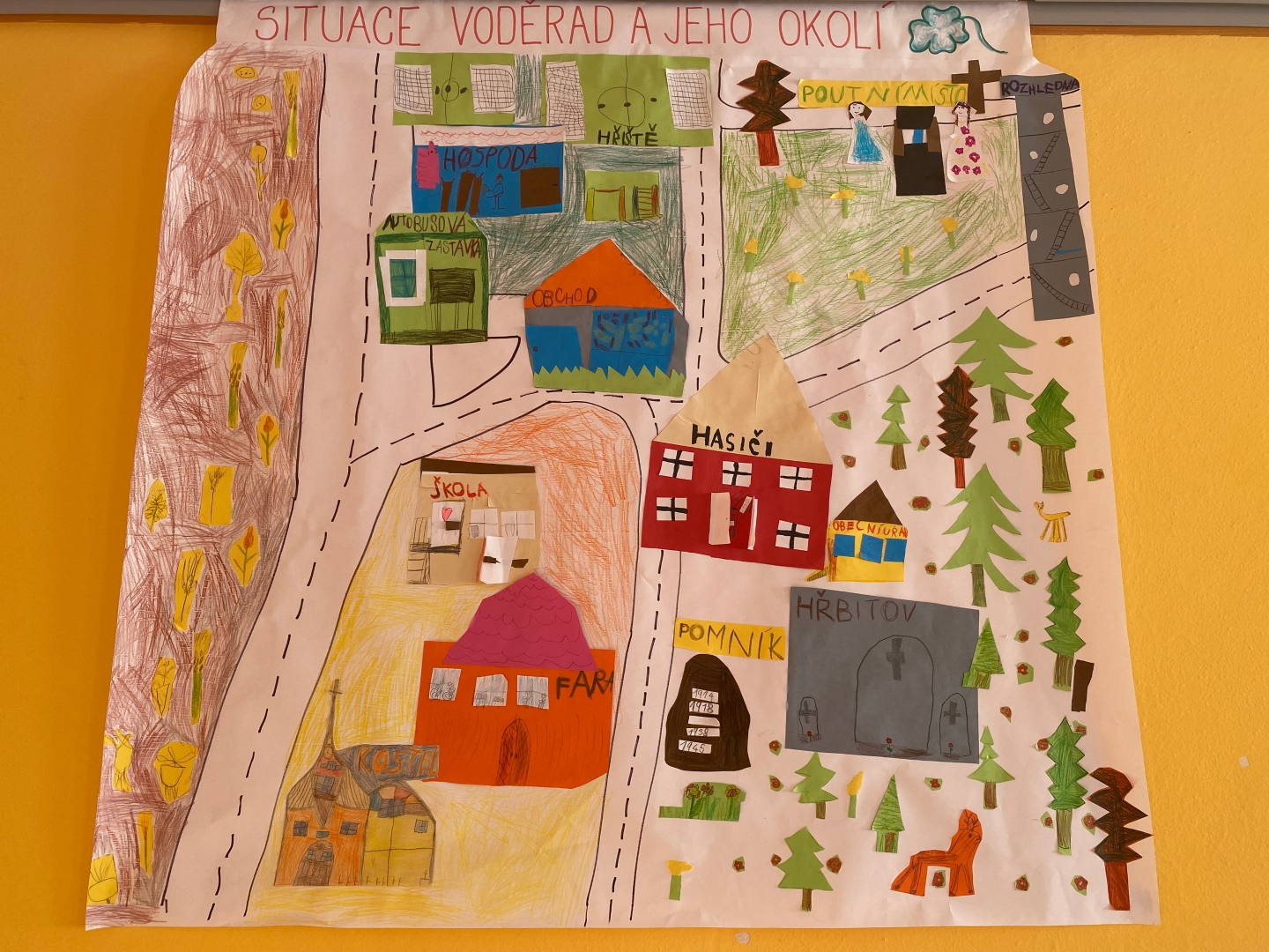 Společně jsme namalovali na velký formát papíru silnice v obci. Každý si do plánku nalepil svoji práci na příslušné místo. Nakonec jsme plochy vymalovali a pověsili si celý plánek Voděrad do třídy.