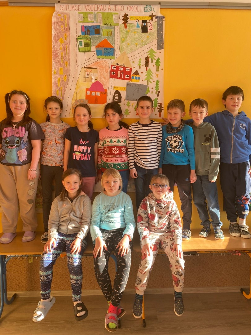Naši druháčci podpořili výuku regionu a zaměřili se na tvorbu vlastnoručně vytvořené mapy Voděrad. Posílili jsme vnímání žáků o zařazení takzvaných měkkých dovedností - schopnost aktivně naslouchat. Se žáky jsme prošli obcí a nejbližším okolím. Každý z žáků si vybral jednu budovu nebo místo a začal ho aktivně tvořit pomocí barevných papírů. Druháci už znají všechna písmena, takže si svůj výrobek i popsali.