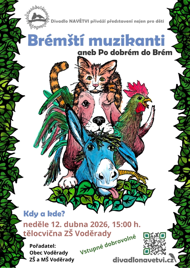 přijměte pozvání na divadelní představení "Brémští muzikanti aneb Po dobrém do Brém" v neděli 12. dubna 2026 od 15 hodin v tělocvičně školy. Pořadatelem je obec Voděrady ve spolupráci s naší školou. Podrobné informace naleznete v pozvánce v příloze.