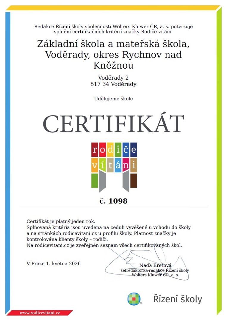 S obrovskou radostí vám oznamujeme, že naše mateřská škola získala prestižní certifikát kvality RODIČE VÍTÁNI! Jsme nesmírně hrdí na to, že jsme v současnosti dokonce jedinou školkou v našem regionu, která se tímto titulem může pyšnit. Toto ocenění, které vyžaduje splnění přísných kritérií, je krásným důkazem toho, že naše školka funguje jako opravdová komunita postavená na vzájemné důvěře a otevřenosti.